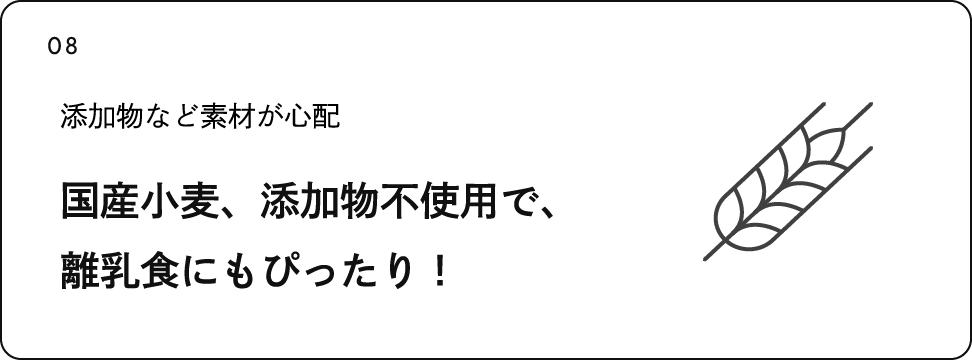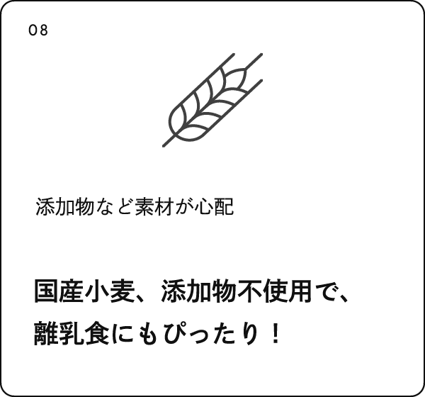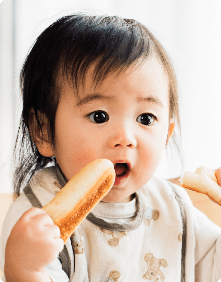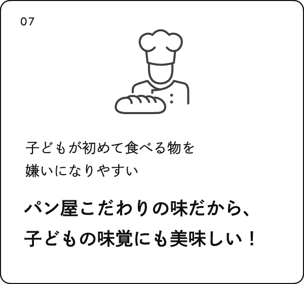妊娠中でも安心して食べられる、マタニティフード認定のパンです。厳しい基準をクリアし、ママと赤ちゃんのためにやさしい素材で作りました。安心してお召し上がりいただけます。