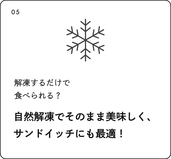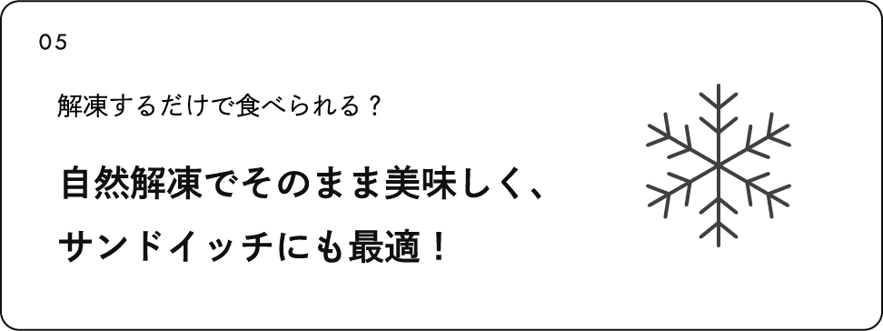 室温で解凍してください。パンの中にあるでんぷんは、2~4℃の温度帯が最も老化しやすく、風味も損なわれてしまうので、冷蔵庫では絶対に解凍しないでください。トーストする場合は、5枚切りや6枚切りでしたら凍ったままトースターに入れてください。